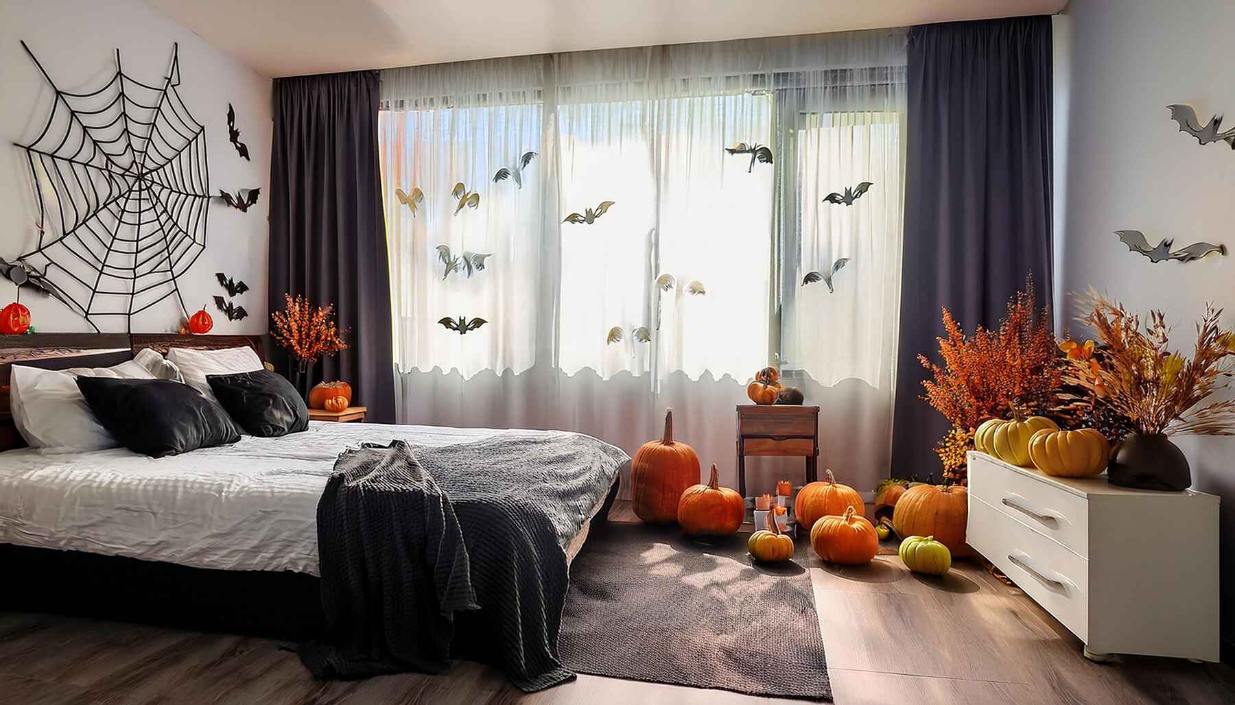 This bedroom has a complete haunted house theme Halloween makeover. The bright wings of the orange walls immediately grab attention and create the ideal environment for the spooky decoration. The place is filled with black spiderwebs, silhouettes and hanging bats that give the place a creepy quality. This haunted house prop above the bed gives the room a theatrical appearance, giving it a Halloween movie appearance. The bedding displays pumpkins, spiders and ghosts, which follows the theme altogether. It’s definitely a big yes for this year's trends and decorations.